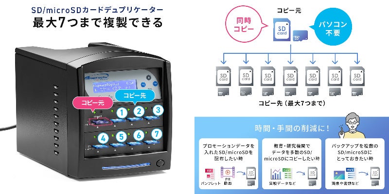 本製品は、パソコンなしでメディア(SDカード、USBメモリ)をコピーできるデュプリケーターです。最大7つまで一度に複製することができます。