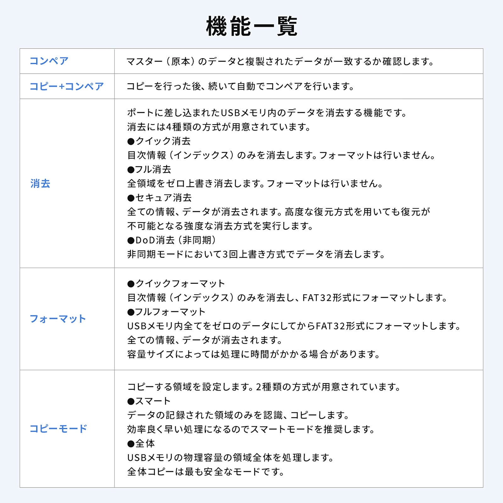 機能はコンペア、消去、フォーマットなどの機能があります。