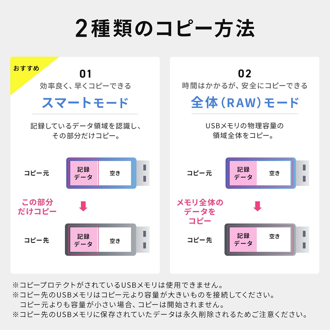 2種類のコピー方法があり、早くコピーするスマートモード、完全にコピーする全体(RAW)モードが選べます。