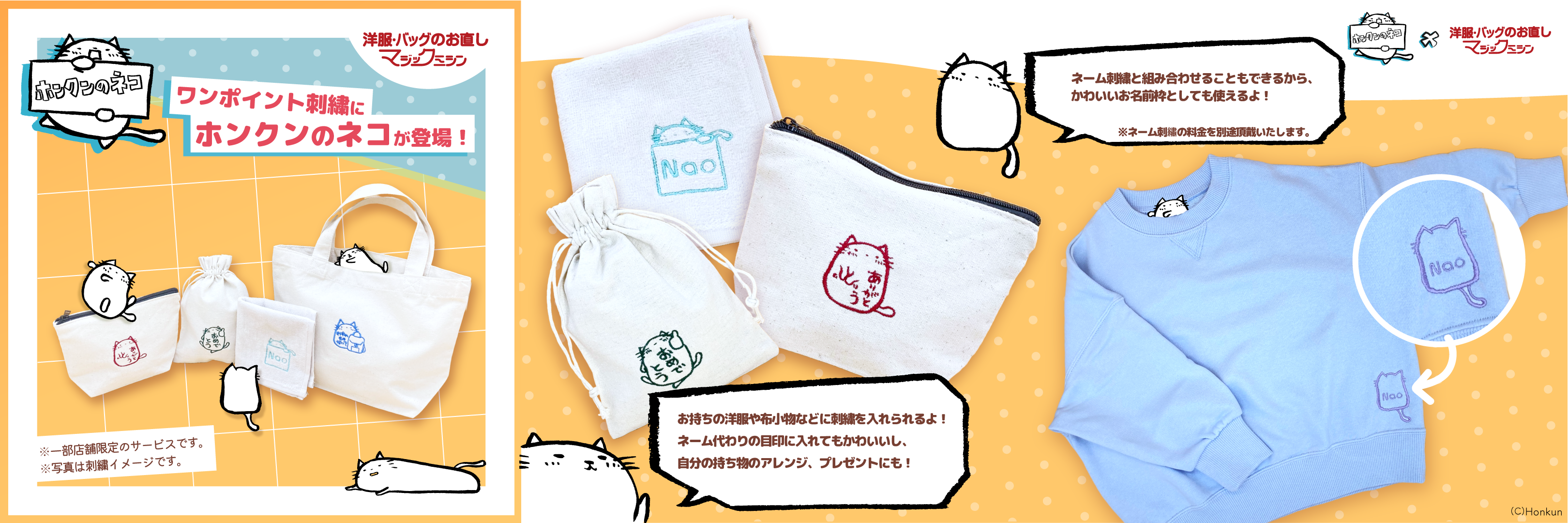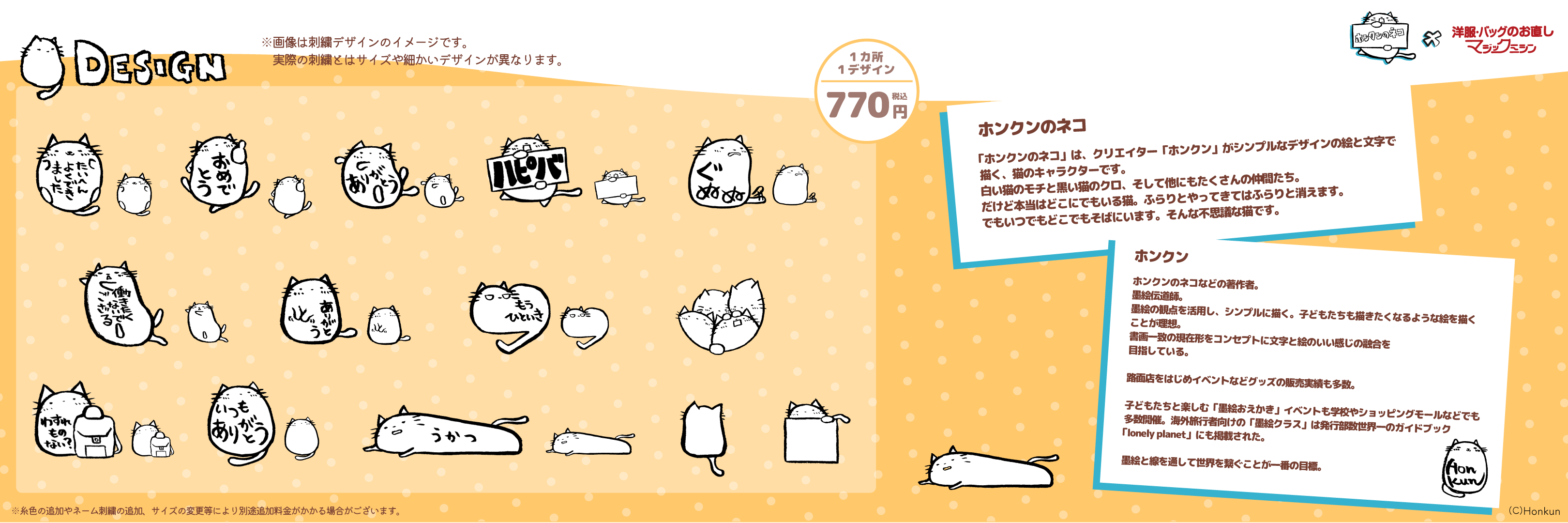 既存のワンポイントデザインに加え、「ホンクンのネコ」を起用した新デザインが登場。お好きなデザインをお選びいただき、刺繍することができます。