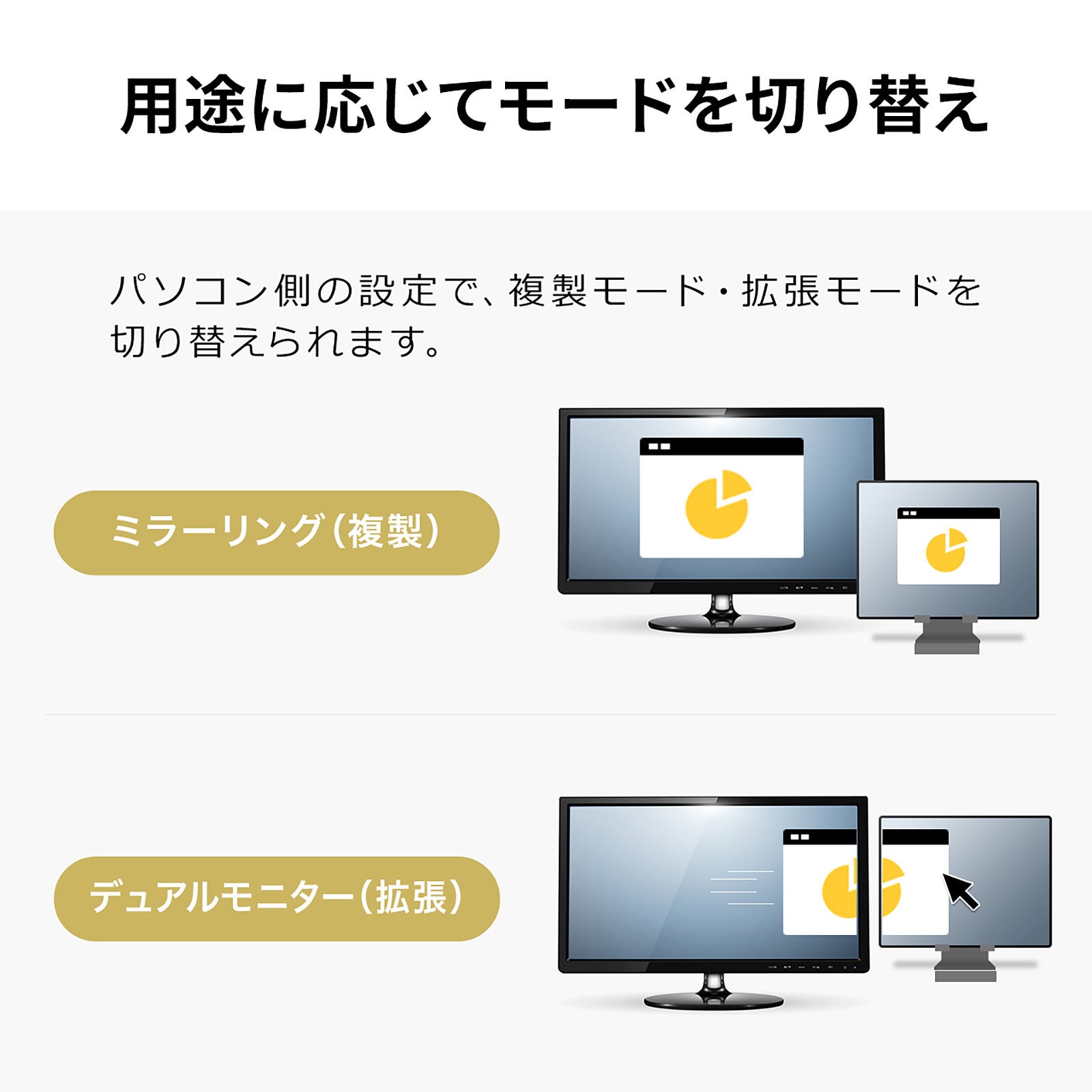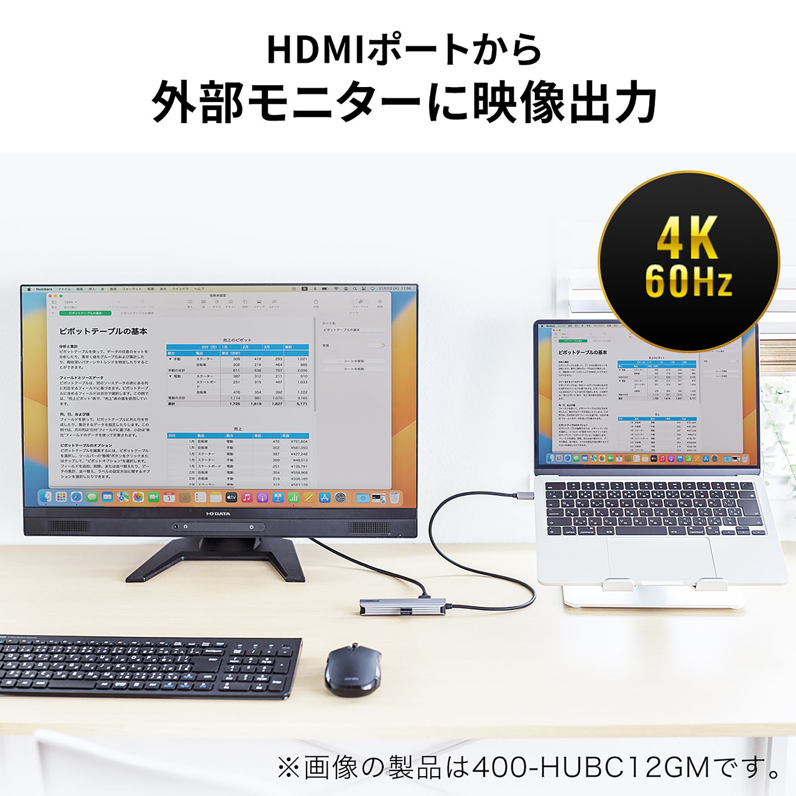 HDMI出力4K/60Hz対応で、ソフトウェアのインストールなしで簡単にマルチディスプレイ環境(ミラーモード/拡張モード)を実現できます。USB Type-Cコネクタ採用で、Type-Cポートを搭載したパソコンなどで使用できます。