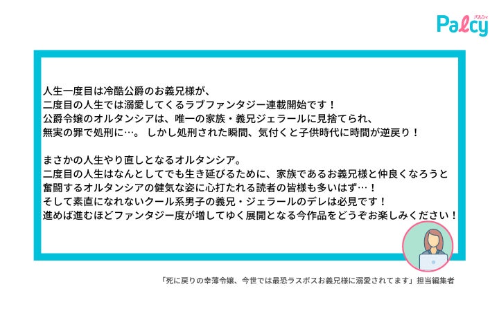 『死に戻りの幸薄令嬢、今世では最恐ラスボスお義兄様に溺愛されてます』は少女・女性マンガアプリPalcyにて連載され、毎週金曜日に更新予定。