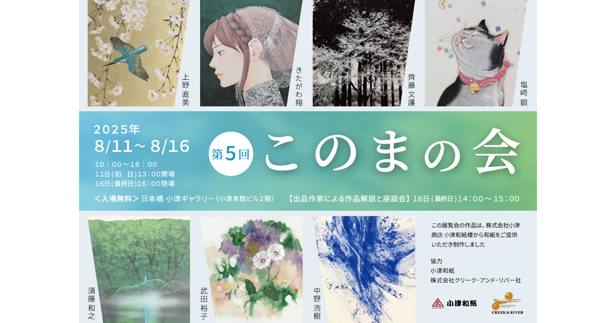 現代日本画家 須藤和之氏が2021年に発足した、現代作家グループ「このまの会」が開催する美術展覧会。日本画、写真、油彩、漫画などさまざまな領域を専門とする作家が集まり、日本の伝統的な素材である和紙を取り入れて異なるジャンルへの挑戦に取り組む。制作にあたっての和紙は江戸時代より370年以上続く小津和紙が提供。