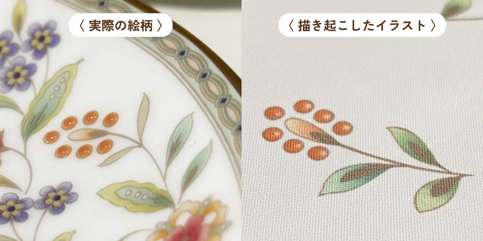一粒ずつ手作業でほどこす「半球盛」のぷっくりとしたつや感や、あたたかみのある色彩をイラストで再現しています。ノリタケのデザイナーによる細かなチェックを経て、磁器の焼成後のような奥行き感や美しいグラデーションまで忠実に表現しています。