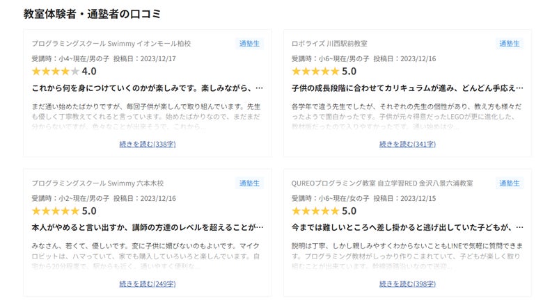 保護者の多くはプログラミング学習が未経験ということから「子どもに合うプログラミング教室がわからない」という悩みを抱えるケースも少なくありません。そこで「コエテコ byGMO」では2018年より、保護者がプログラミング教育を選ぶ際に判断の重要な指標となる、「利用者の声」(口コミ)の掲載を開始しました。掲載されている口コミは「コエテコ byGMO」を通じて体験の申し込みを行った保護者のみを対象としているため実体験に基づくリアルな口コミとなっており、口コミをもとにサイトの利用者に安心して教室をお選びいただいています。2023年11月から12月にかけて実施した調査で、掲載されているプログラミング教室に関する口コミ掲載数は8,654件となり、小学生を対象とするプログラミング・ロボット教室が検索できるサイトにおいて、口コミ掲載数がNo.1となりました。