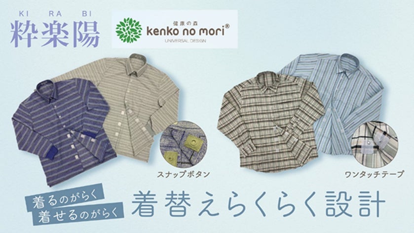 男性シニア向けブランド「粋楽陽(きらび)」は、加齢に伴う体型変化や身体能力低下をサポートする商品を提案しています。今回発売の「健康の森」とのコラボ商品では、“もっと簡単に着脱できるボタンにしてほしい”“気分が上がるような明るい色やキレイな色の服を着たい”といったお客さまの声を反映し、留め外しがよりしやすいように改良したスナップボタンやワンタッチテープを使用し、機能性にこだわりつつも、明るいカラーを揃えるなどデザイン性も重視した商品を展開します。