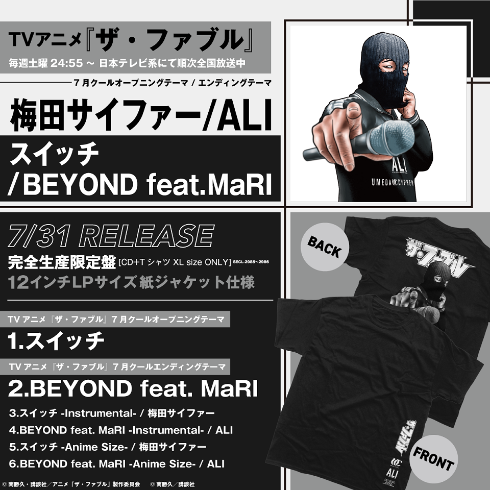 本楽曲は、TVアニメ『ザ・ファブル』第2クールのエンディングテーマとなっており、同じくオープニングテーマを務める梅田サイファーとALIのスプリットシングル「スイッチ / BEYOND feat. MaRI」として7月31日(水)にパッケージリリース。原作者の南 勝久氏の書き下ろしジャケットが描かれた12インチレコードサイズの紙ジャケットに、同イラストがプリントされたここでしか手に入らないトリプルコラボTシャツが付属する。