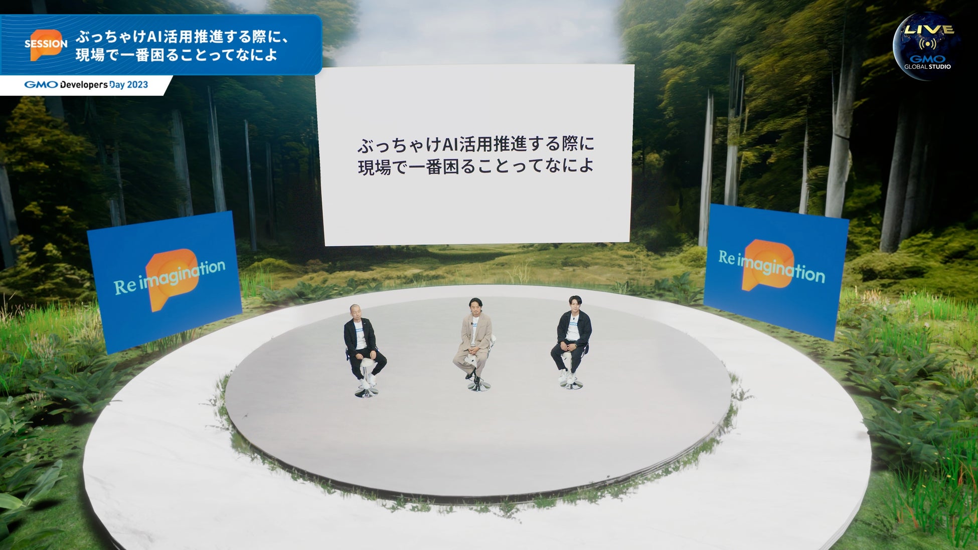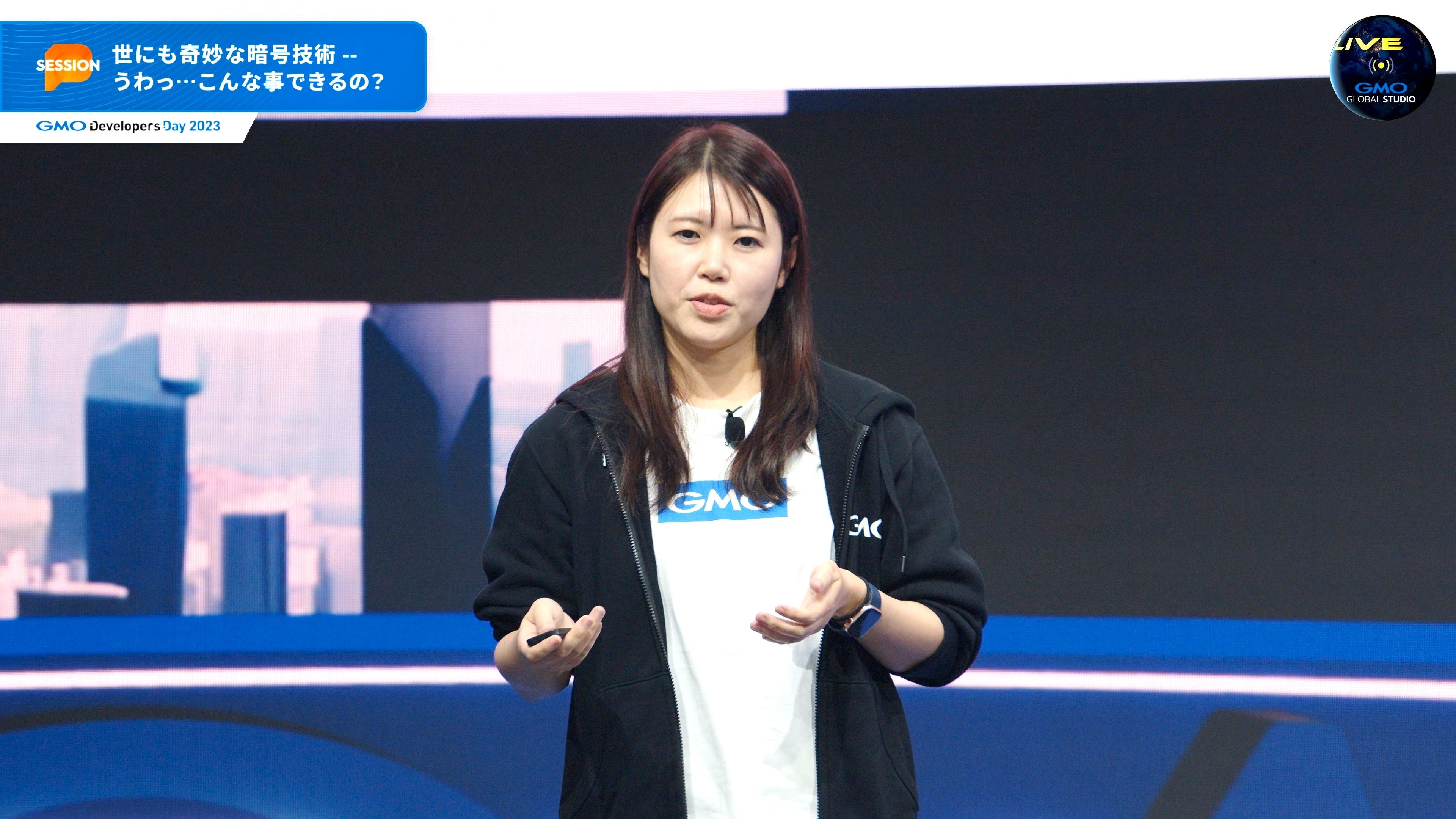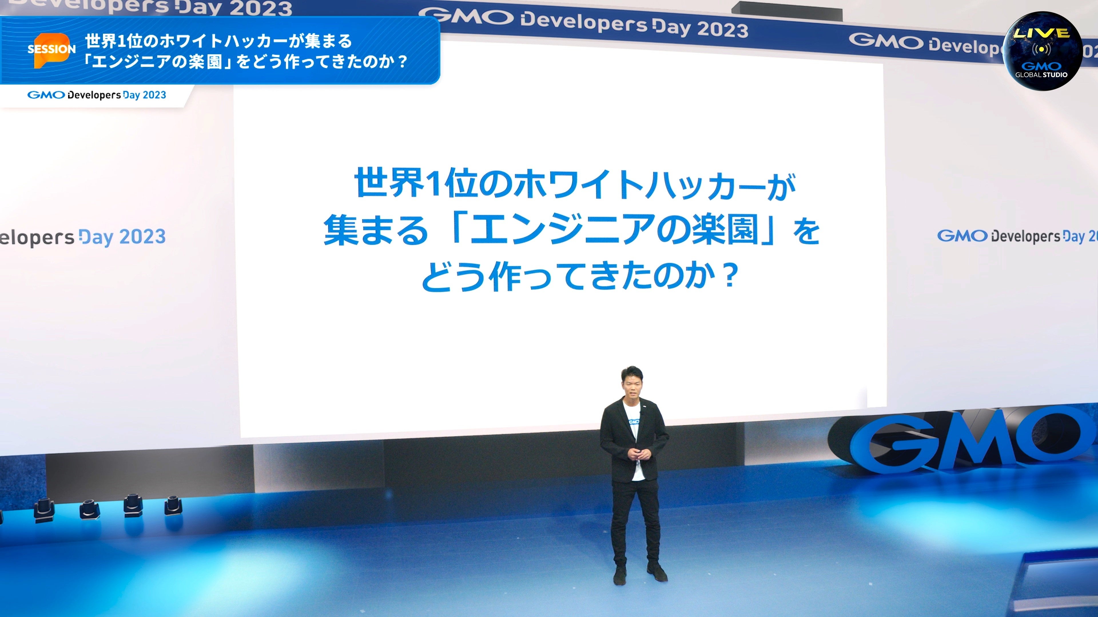 「GMO Developers Day 2023」は、東京・世田谷区用賀の「GMOインターネットTOWER」内にプレオープンしたばかりの最新技術を駆使したXRバーチャルスタジオ「GMO GLOBAL STUDIO」(https://www.global-studio.gmo/)よりYouTube Liveで生配信しました。