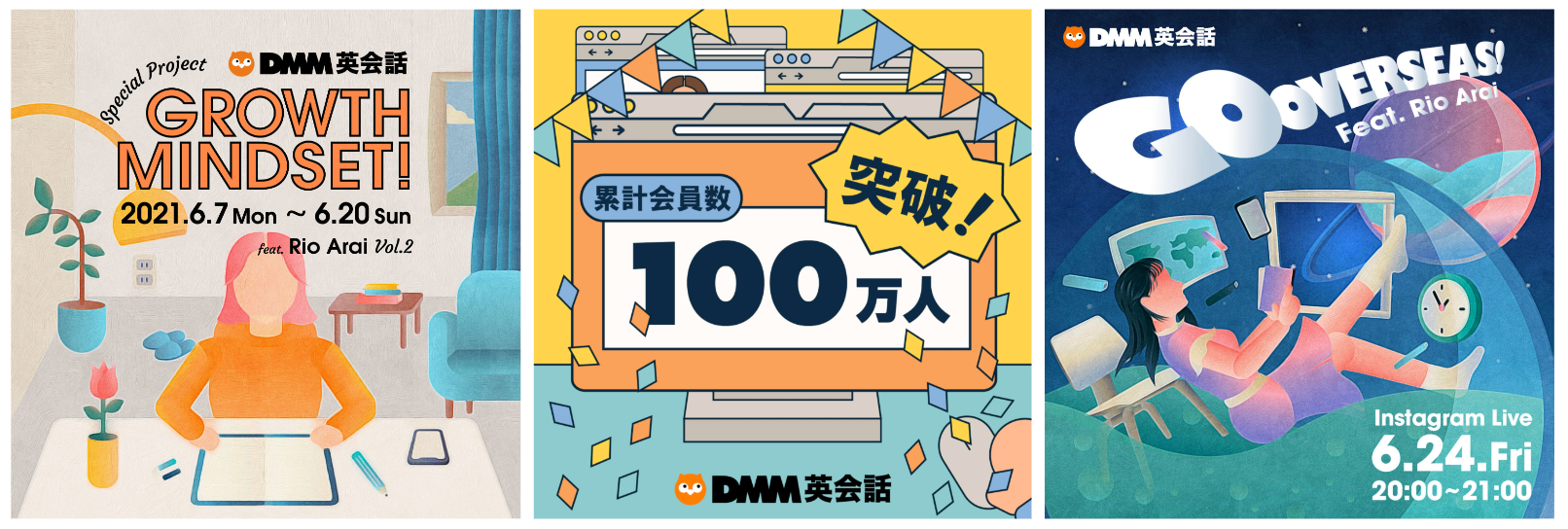 憂鬱な気分になりやすい梅雨シーズンのモチベーションアップ企画として、イラストレーター、作家、ミュージシャンなど幅広い活躍をしながら、英語学習者としても注目を集めている新井リオさんとDMM英会話のユーザー2名をゲストに迎えたインスタグラムライブを実施。ユーザーならではの視点を交え、DMM英会話や英語学習についてトークを展開します。