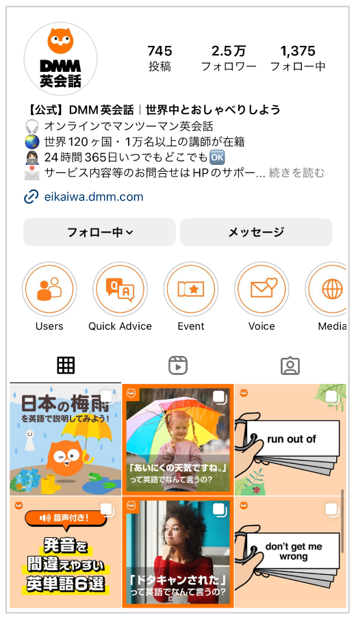 DMM英会話公式Instagram( https://www.instagram.com/dmmeikaiwa/ )は、2020年5月にリニューアルを実施。「英語でなんてuKnow?」や「DMM Eikaiwa MANGA」の連載、日本人が間違えやすい英語表現やスラング紹介などのオリジナル企画を展開し、英語や異文化、世界の多様な価値観に触れられる情報をお届けしています。2022年2月にはフォロワー数2万人を突破しました。