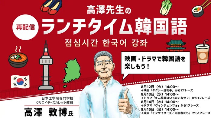 株式会社クリーク・アンド・リバー社(C&R社)は2025年8月12日(火)~15日(金)、今年6・7月に開催した韓国語を学ぶセミナーシリーズ「高澤先生のランチタイム韓国語 映画・ドラマで韓国語を楽しもう!」を再配信します(オンライン・無料)。