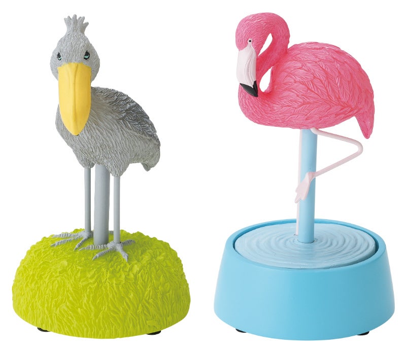ハシビロコウはエサを捕らえるために動かない姿を、フラミンゴは水辺で水に体温を奪われにくくするため片足で立っている姿を見事に再現。