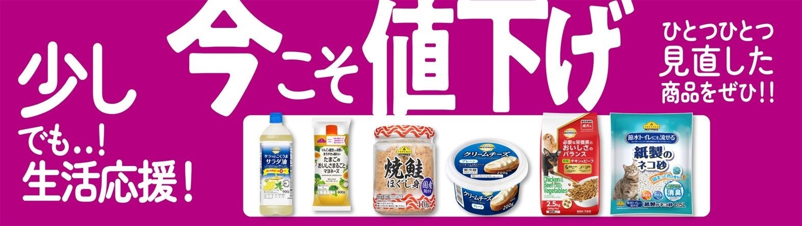 第3弾となる今回は新たに、「サラダ油」や「マヨネーズ」「焼鮭ほぐし身」「クリームチーズ」などの毎日の食卓を支える品に「ドッグフード」「ネコ砂」など暮らしを支える品を加えた※1、28品目を厳選しています。物価高が続く中、「少しでも支出は抑えたい」、「節約しつつ日々の生活を充実させたい」といったお客さまの期待にお応えします。
