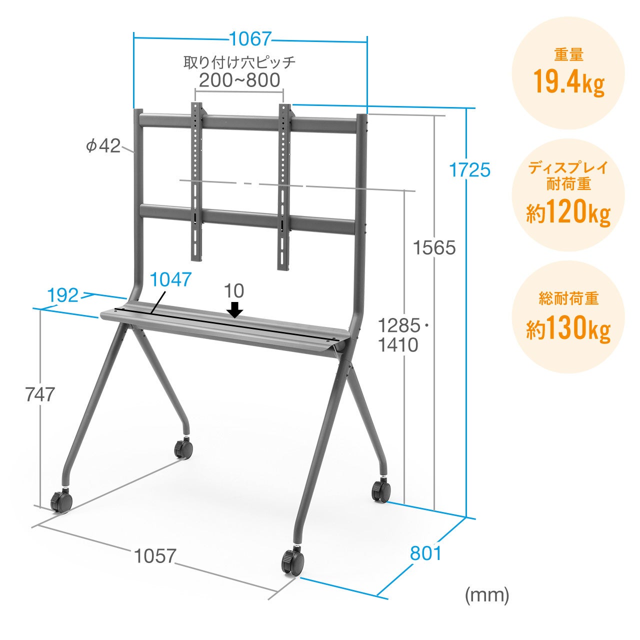 本製品は、テレビ会議システム内蔵ディスプレイや電子黒板などの設置に最適で120kgまでの機器の設置ができるディスプレイスタンドです。
