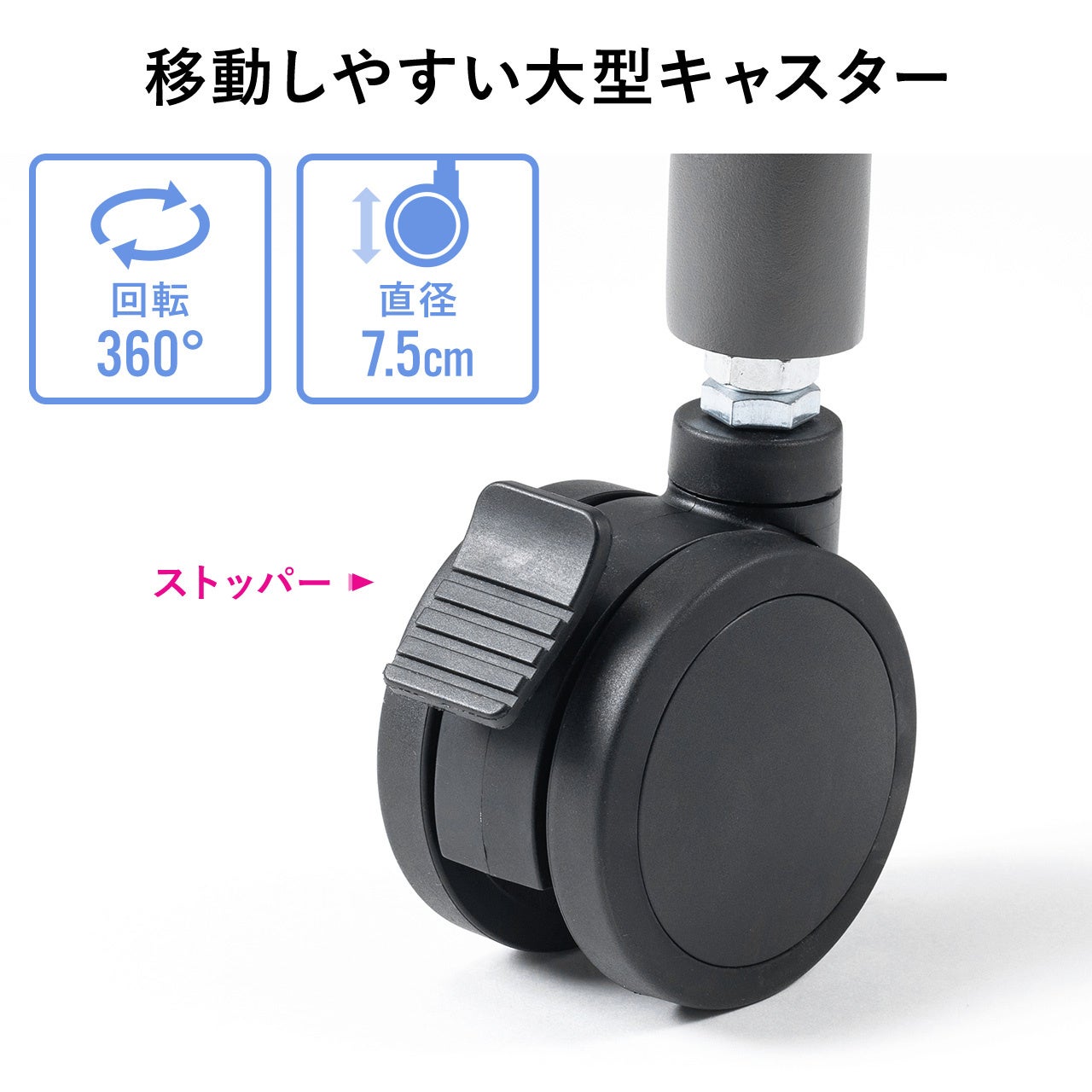 キャスターは直径約7.5cmで360度回転が可能です。周辺機器の設置に便利な中棚付きです。