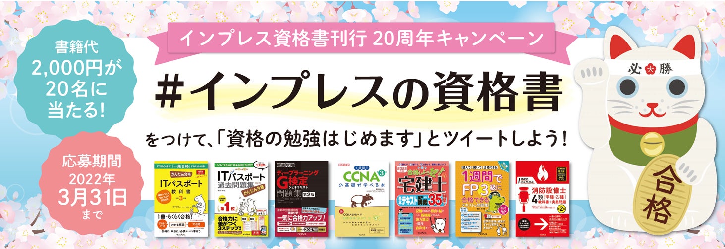 インプレスグループでIT関連メディア事業を展開する株式会社インプレス(本社:東京都千代田区、代表取締役社長:小川 亨)は、資格試験対策書の発売20周年を記念して、Twitterで資格にチャレンジ宣言をした人の中から抽選で20名に書籍代2,000円分を支援する、「#インプレスの資格書」20周年キャンペーンを2022年1月17日(月)より実施いたします。