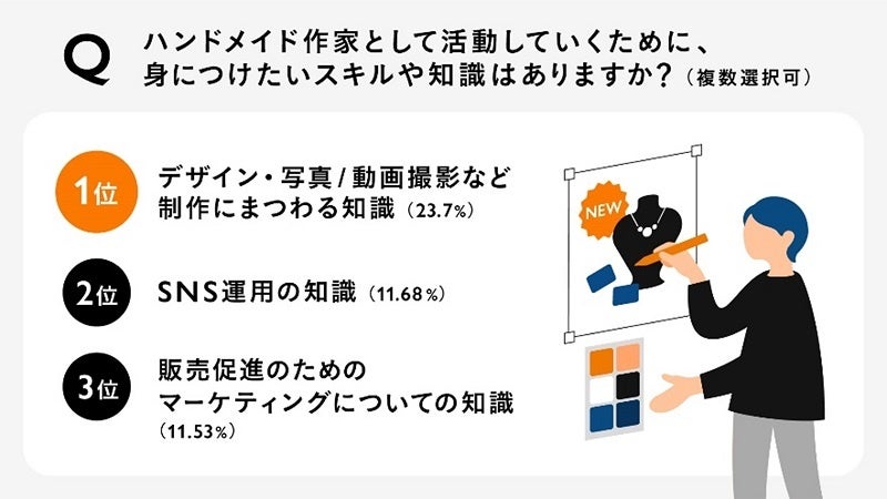 「minne byGMOペパボ」がハンドメイド作家に対し実施した調査(※3)によると、「ハンドメイド作家が活動していくために身につけたいスキルや知識」として1位:デザインや写真・動画撮影など制作にまつわる知識(23.7%)、2位:「SNS運用の知識」(11.68%)、3位:「マーケティングについての知識」(11.53%)となっており、販促にかかるスキルアップの需要があると考えられます。