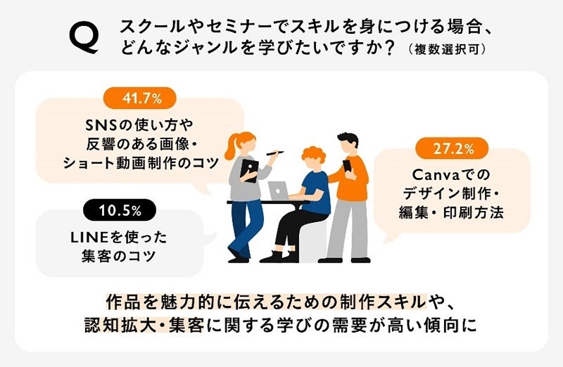 また同時に、「スクールやセミナーで学びたい具体的なジャンル」として1位:「SNSの使い方や、反響のある画像・ショート動画制作のコツ」(41.7%)、2位:「Canvaでのデザイン制作・編集・印刷方法」(27.2%)がランクインしました。