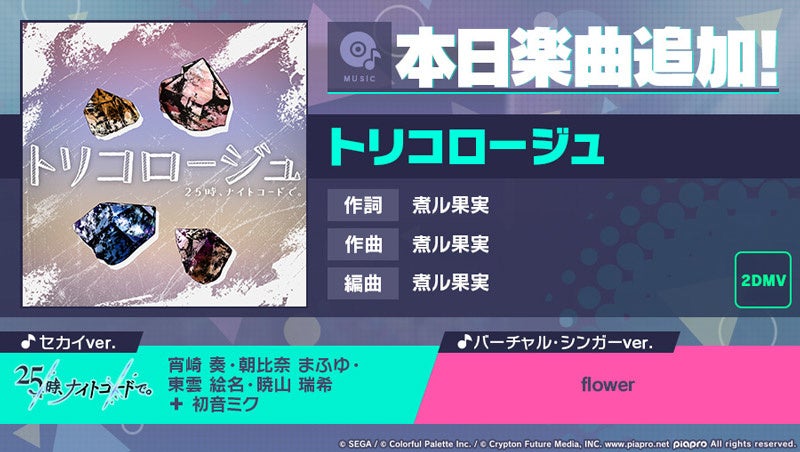 株式会社セガ(本社:東京都品川区、代表取締役社長COO:杉野行雄)と株式会社Colorful Palette(本社:東京都渋谷区、代表取締役社長:近藤裕一郎)は、iOS/Android向けリズム&アドベンチャー『プロジェクトセカイ カラフルステージ! feat. 初音ミク(以下、プロジェクトセカイ)』について、2022年1月21日(金)より煮ル果実さんの書き下ろし楽曲「トリコロージュ」をゲーム内に追加いたしました。
