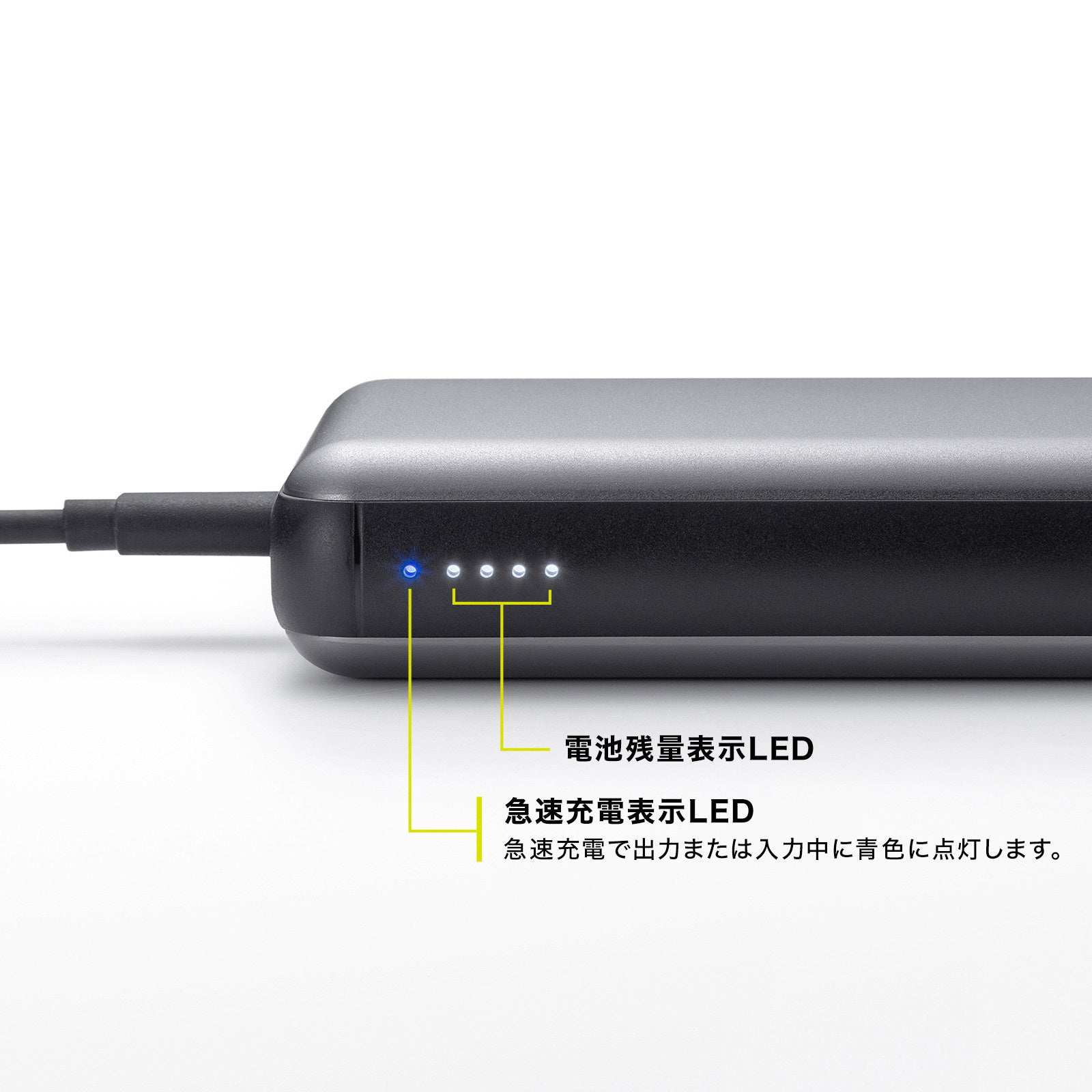 急速充電での出力または入力を確認できる急速充電表示用のお知らせLEDを搭載しています。4灯の電池残量表示LEDと合わせて急速充電状態をひと目で確認できます。
