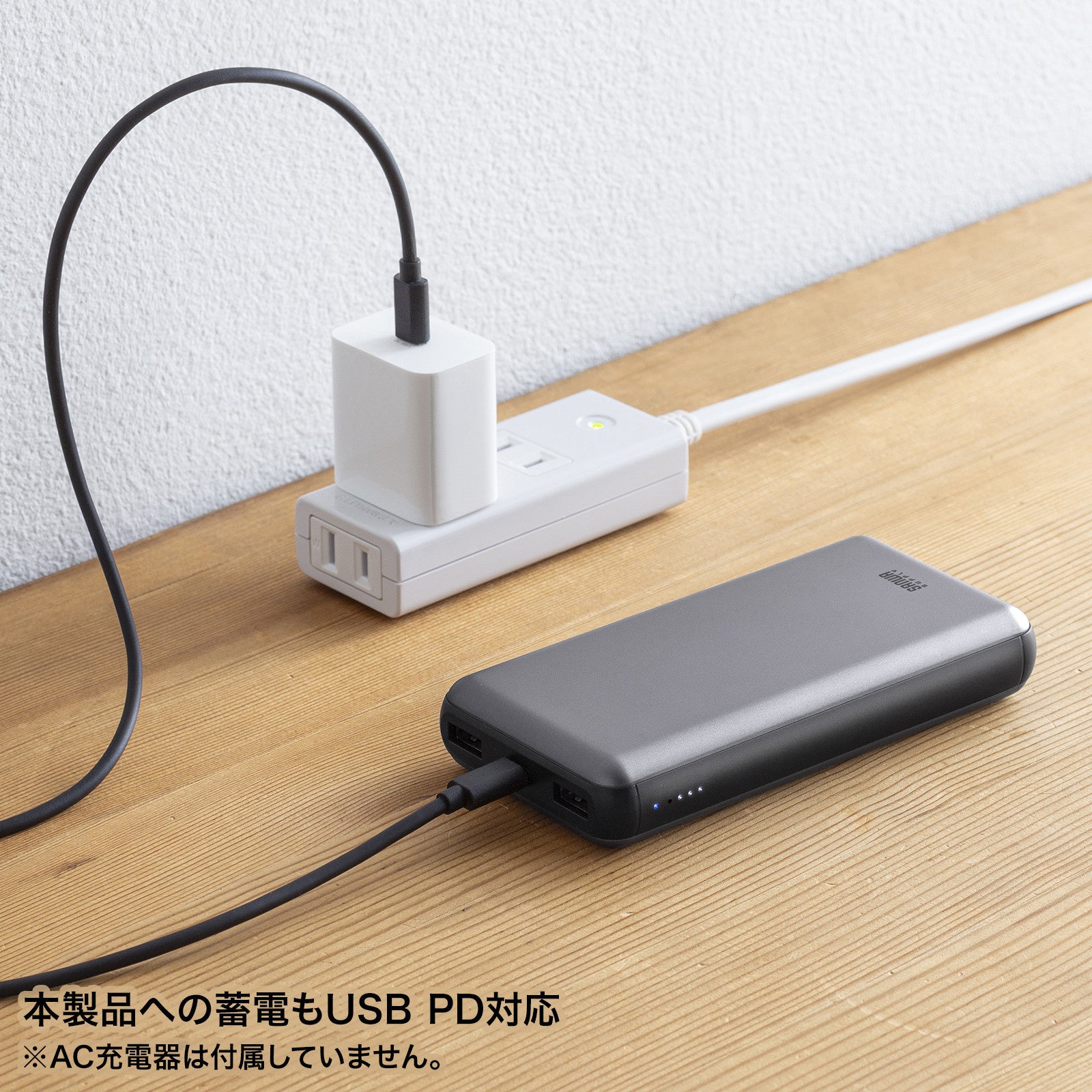 USB PD規格による最大20W出力の高速充電に対応し、3台同時充電が可能なモバイルバッテリー