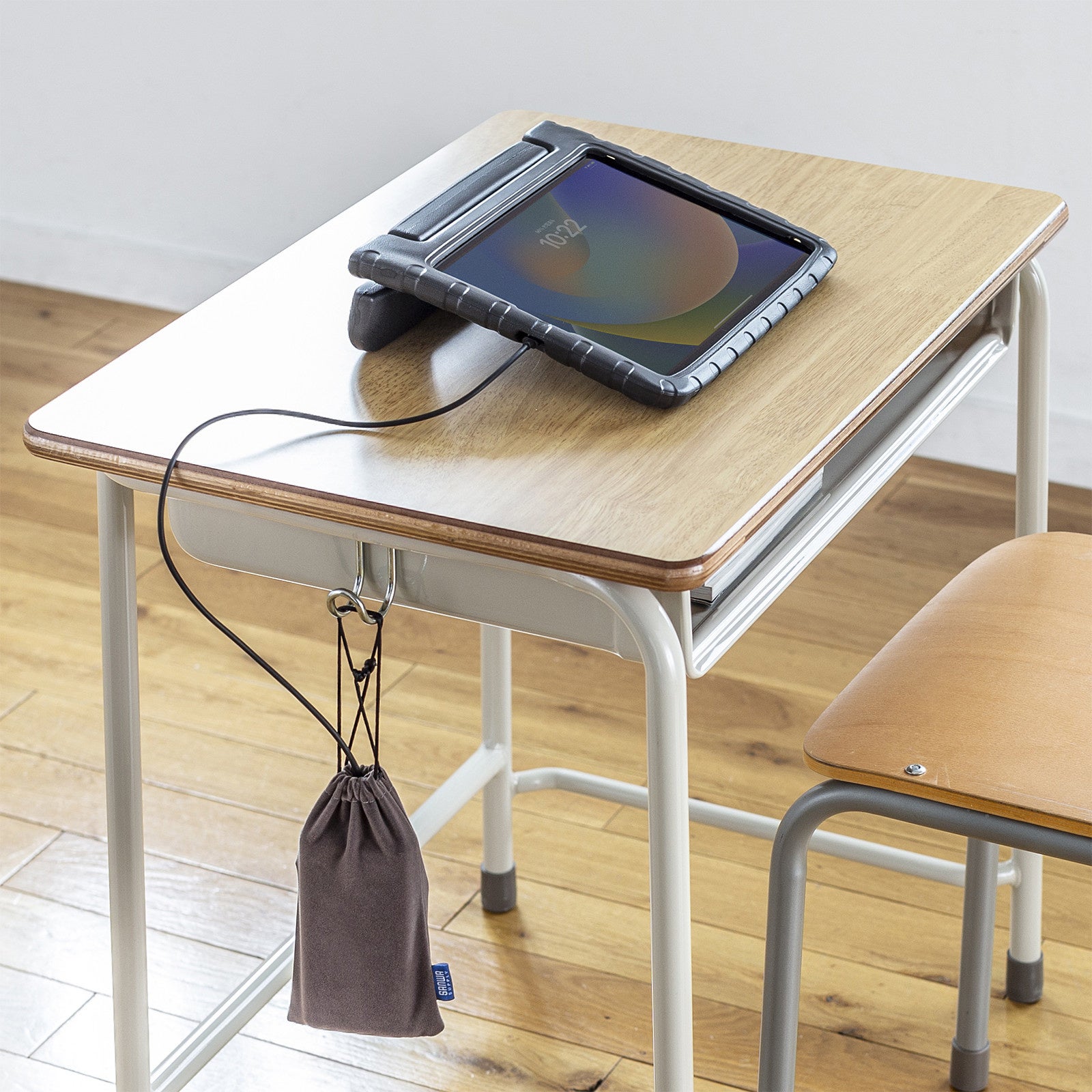 また、付属のType-Cケーブルは1.2mと長めで、本体を収納ポーチに入れたまま学校机のフックに引っ掛けた状態で機器の充電ができるため、机からの落下の心配がなく卓上スペースも有効に使用できます。