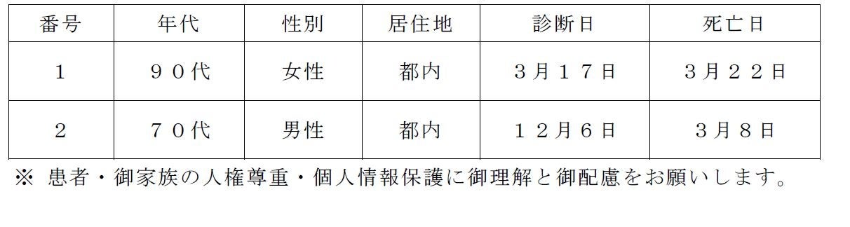 都内で新型コロナウイルスに感染した方が死亡されましたのでお知らせします。