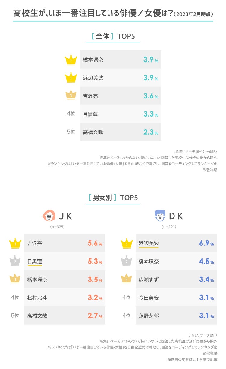 全体では「橋本環奈」「浜辺美波」が同率1位という結果になりました。「橋本環奈」は女子高生で3位で、男子高生で2位にランクインしました。「浜辺美波」は男子高生で1位となりましたが、前回の同調査(2021年)でも男子高生で1位でした。