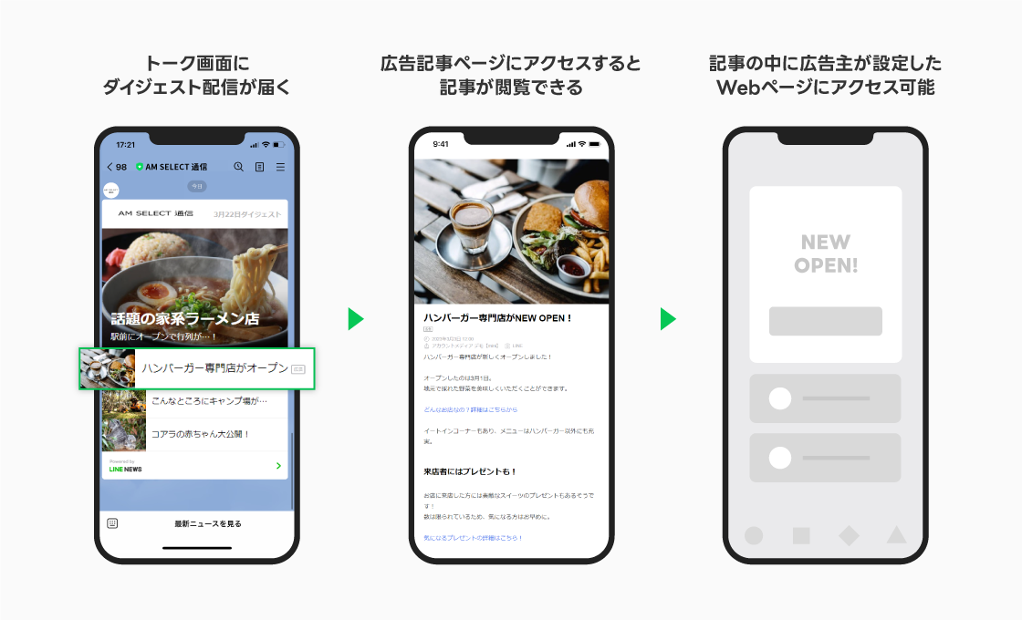2015年に提供を開始した「LINEアカウントメディア」では、これまで430以上*2の参画メディアが独自の視点で厳選した記事を各アカウントのフォロワーに向けてお届けしてまいりました。「LINEアカウントメディア」の広告メニュー「DIGEST Spot for アカウントメディア」では、LINEのトークにプッシュ配信される「ダイジェスト記事」の一部を広告枠として、1日1枠限定で出稿することが可能です。広告記事からは、広告主が指定したウェブサイトへ誘導することができ、これまで「Go to Eatキャンペーン」商品券の販売告知時に「DIGEST Spot for アカウントメディア」を活用し、広く県内で周知するなど、多くの参画メディア・広告主にご利用いただいています。