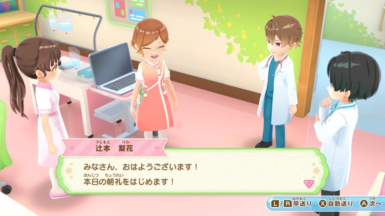 本作はプレイヤー(主人公)が新人ナースとして、小児科病院に配属されるところから物語が始まります。病気やケガで来院する患者さんを元気にするため、頼りになるお医者さんや先輩ナースに助けられながら、さまざまなお仕事に取り組んでいきます。お仕事をしながら一人前のナースに成長していく様子は、コミカルタッチなストーリーとして描かれているので、楽しくプレイして頂けます。