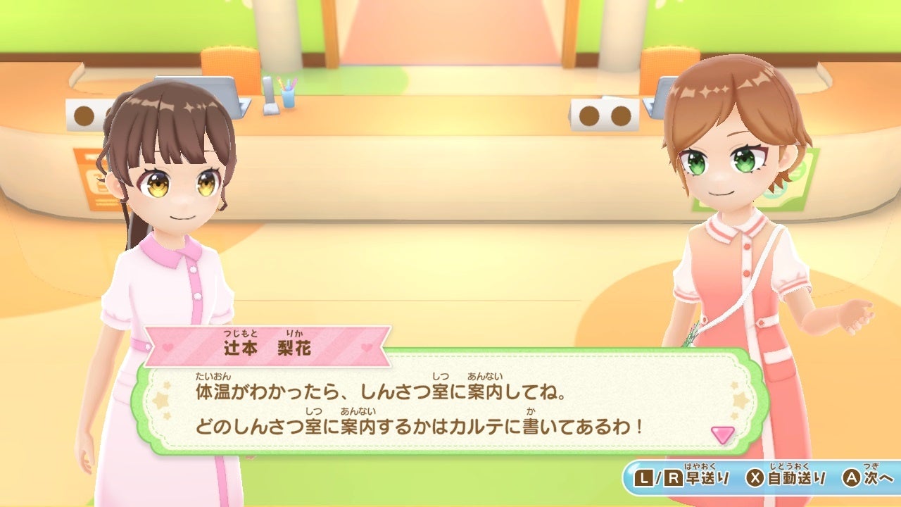 ゲームの中では、外来患者さんの受付や診察室への案内はもちろん、体温測定やケガの治療、薬の受け渡しなど、病院内でナースが行うさまざまなお仕事を、ミニゲーム形式で疑似体験することができます。