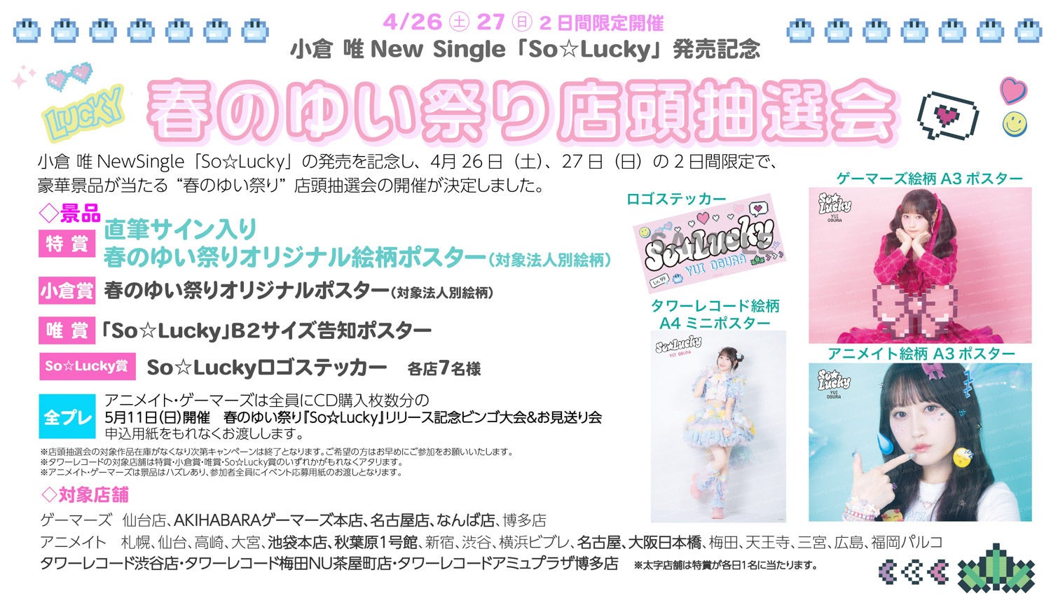 なお、小倉 唯は本日TVアニメ「スライム倒して300年、知らないうちにレベルMAXになってました ~そのに~」のオープニングテーマ曲となるNewシングル「So☆Lucky」を発売したばかり。今週末26日、27日には恒例となった大好評企画「2025年春のゆい祭り」店頭抽選会が全国各地での開催が決定している。