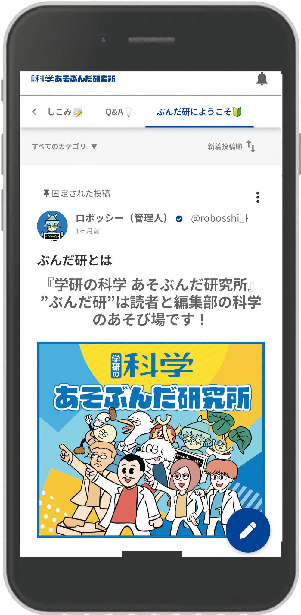 「学研の科学 あそぶんだ研究所」は、無料の会員制オンラインコミュニティ。読者と編集部がいっしょになって科学を楽しむ場です。疑問に思ったことを編集部に質問したり、おうちからワークショップやイベントに参加したり、ここでしかできないオンライン体験がもりだくさんです。