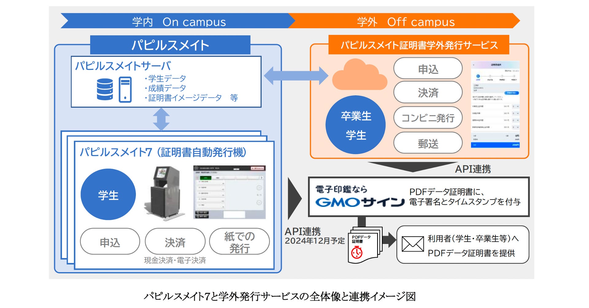 2024年2月より、「パピルスメイト証明書学外発行サービス」とGMOグローバルサイン・HDの「電子署名・タイムスタンプサービス」とを連携して、電子署名とタイムスタンプが追加されたPDFデータ証明書の提供を開始します。例えば、企業の採用活動で利用の広がるWebでの各種証明書の電子データ提出の際には、利用者の利便性向上と偽造や改ざんのリスクを低減した証明書発行が可能となります。