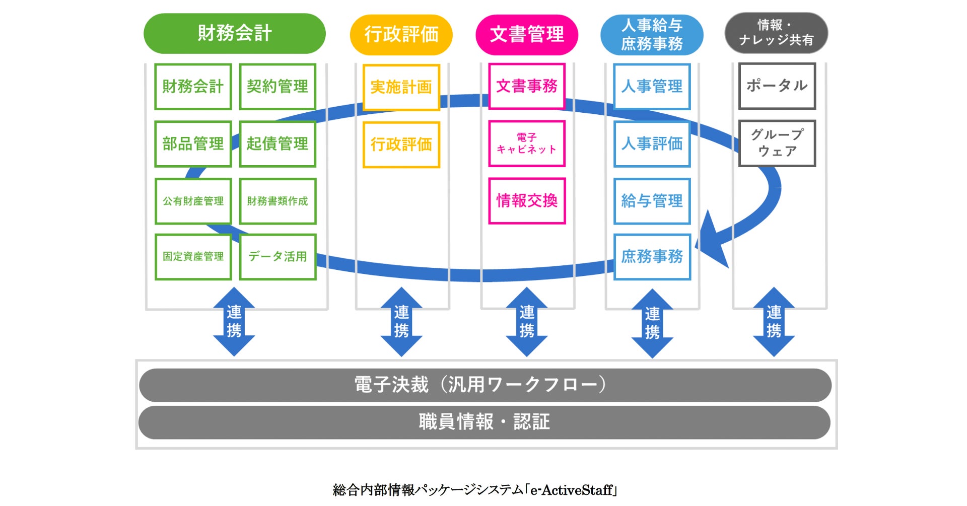 内田洋行の総合内部情報パッケージシステム「e-ActiveStaff」は、財務会計、人事給与、庶務事務、文書管理などの各種システムをパッケージとして統合し、決裁処理やワークフローを一元的に管理できるシステムです。全国の自治体及び関連の約200団体に導入され、ICTの基盤整備を支援しています。