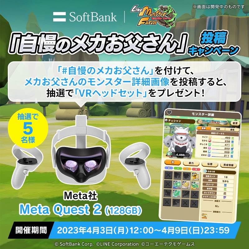 「LINE:モンスターファーム」公式Twitter(@MonsterFarm_L)をフォローして、新モンスター「メカお父さん」を育成し、「メカお父さん育成完了画面」のスクリーンショットと指定のハッシュタグ「#自慢のメカお父さん」を付けてツイートすると、抽選で5名様にVRヘッドセット「Meta Quest 2」が当たります。