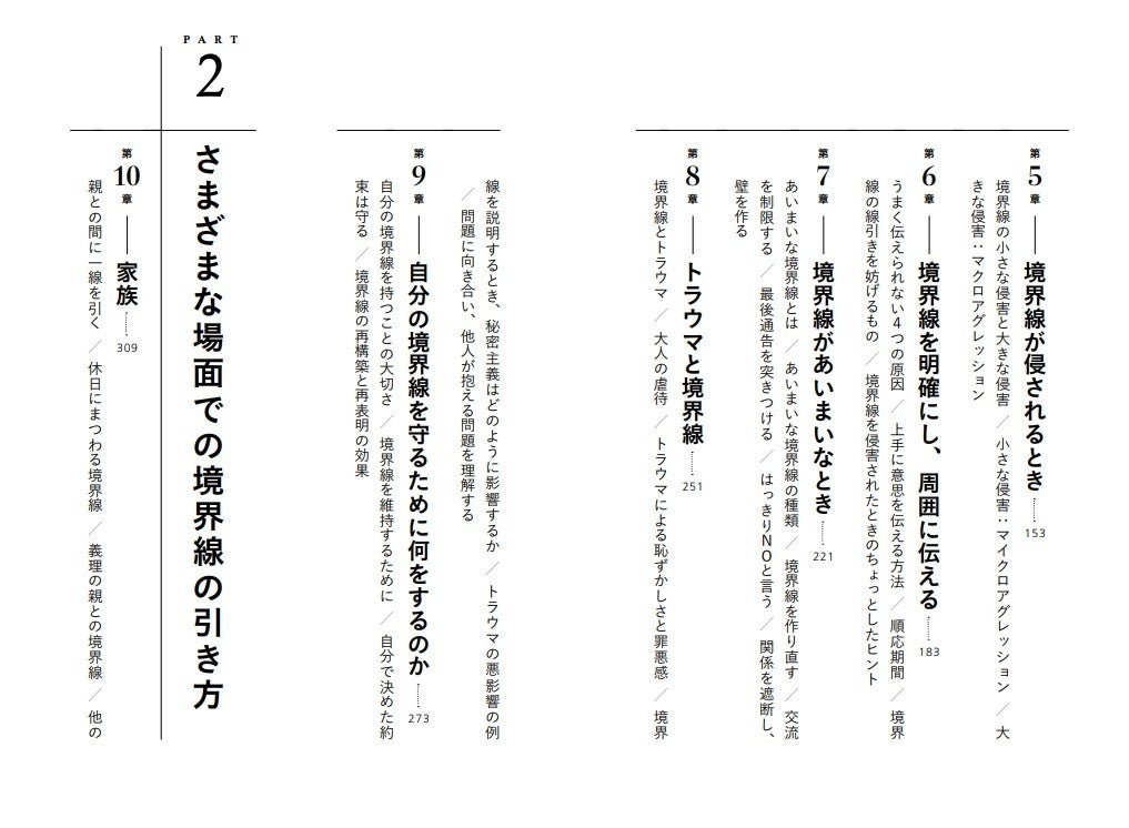 さらに本書では、職場、家庭、SNSなど、さまざまな生活の舞台で理不尽な思いをした場合に必要となる「境界線」の引き方をテーマ別にコーチしています。