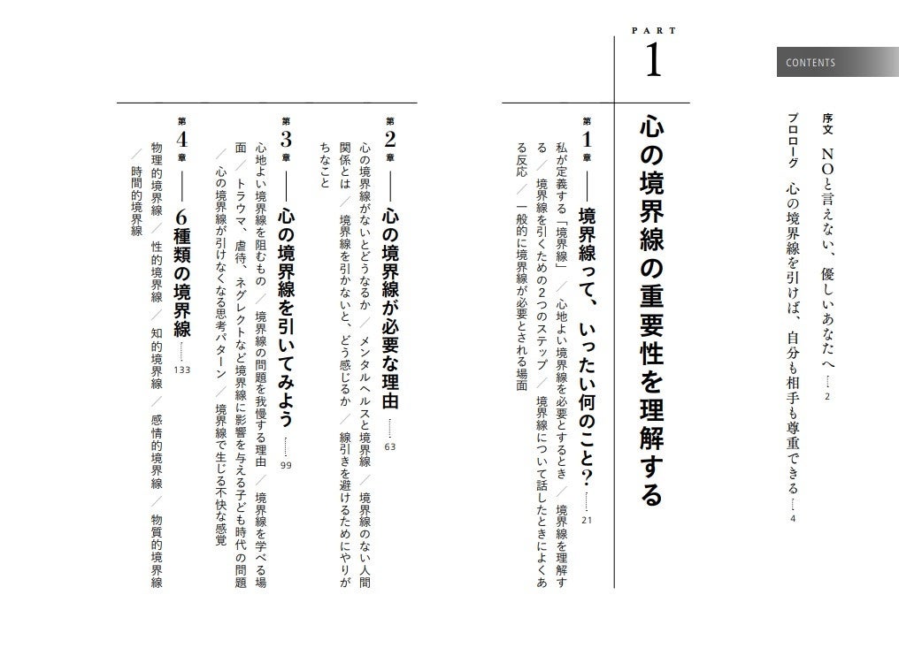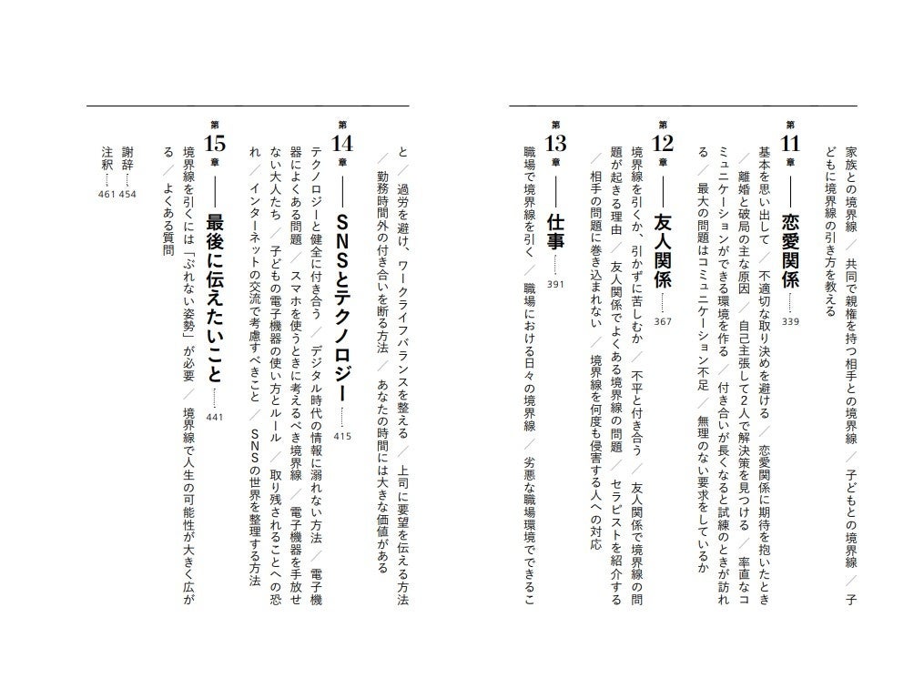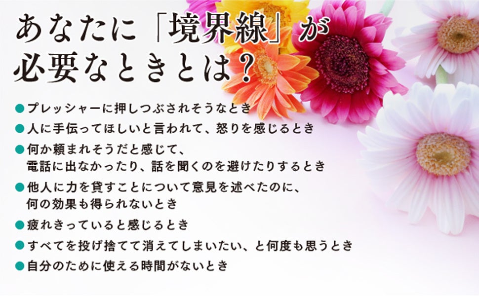 「自分の意思を伝えて“断る”エクササイズ」「自分の過去を振り返って考える境界線の引き方のエクササイズ」「仕事・活動・責任を可視化するためのエクササイズ」など、各章ごとに設置されたエクササイズを経験することによって、あなたは少しずつ境界線を引くための技術を習得していくはずです。
