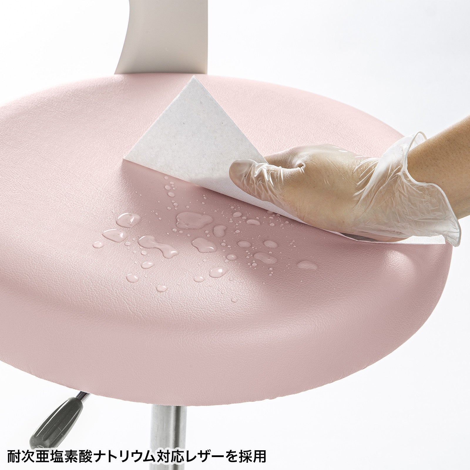 本製品の張材部分には、耐次亜塩素酸ナトリウム仕様のレザーを採用しており、アルコール消毒液などを使用して拭き取りが可能なため、医療現場での使用に最適です。