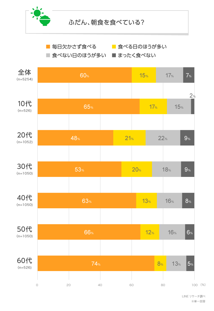 【LINEリサーチ】朝食を「毎日欠かさず食べる」人は全体で6割、すべての年代で高い結果に