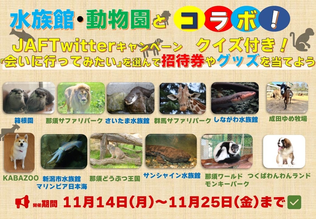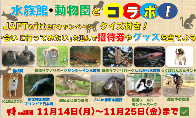 一般社団法人 日本自動車連盟(JAF)関東本部(本部長 関島 誠一)は、11月14日(月)から『水族館・動物園とコラボ!JAFTwitterキャンペーン ~クイズ付き!”会いに行ってみたい”を選んで招待券やグッズを当てよう~』を開催します。