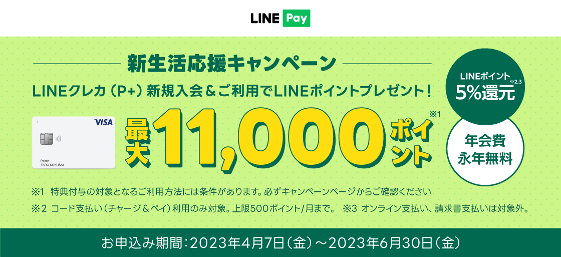 LINE Pay株式会社は、2023年4月7日(金)から2023年6月30日(金)までの間、Visa LINE Payクレジットカード(P+)(以下、LINEクレカ(P+))に新規入会いただき、キャンペーン条件を達成された方に、LINEポイント最大11,000ポイントをプレゼントする「新生活応援キャンペーン」を開催します。
