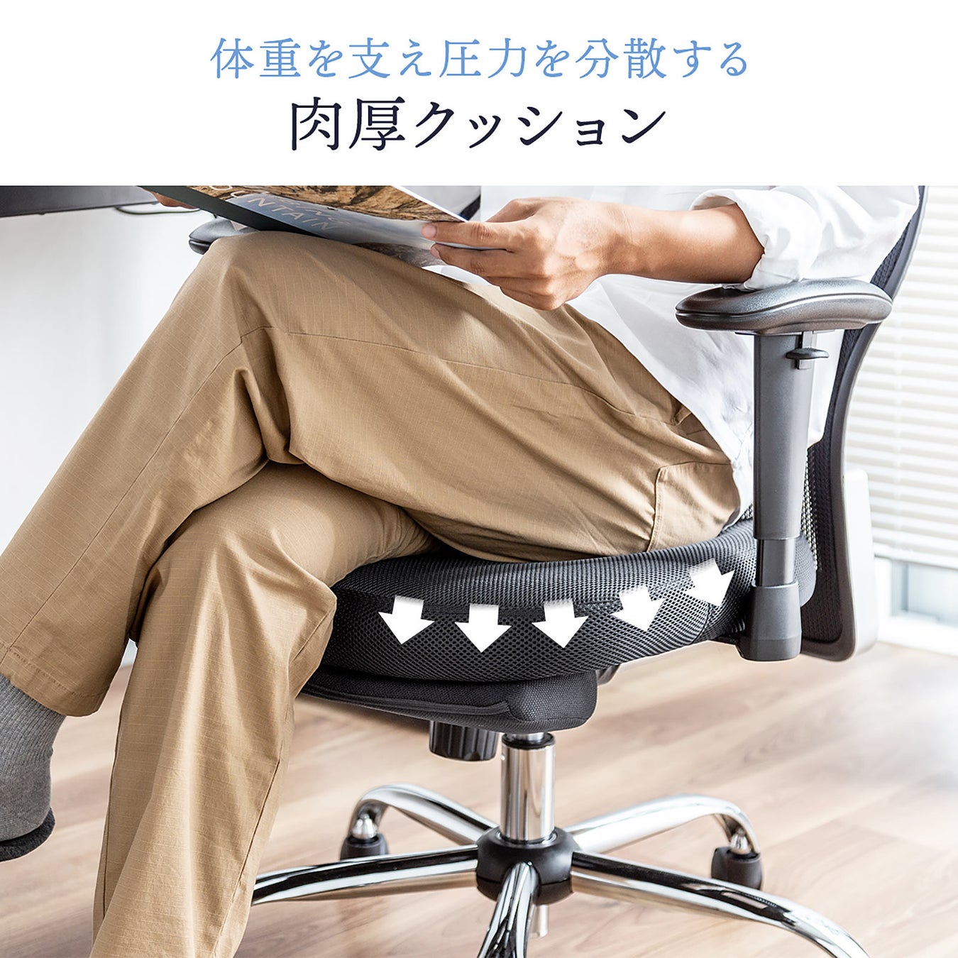 座面はメッシュ生地で肉厚のクッションを施しています。