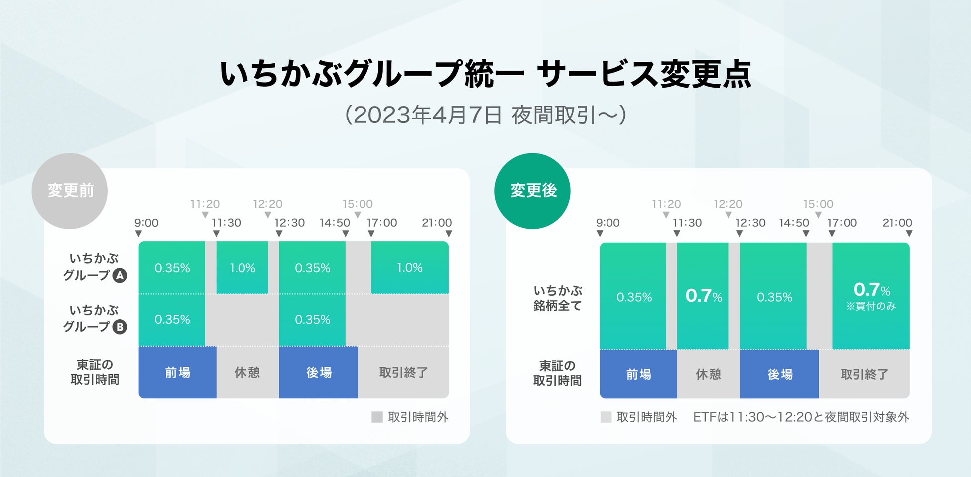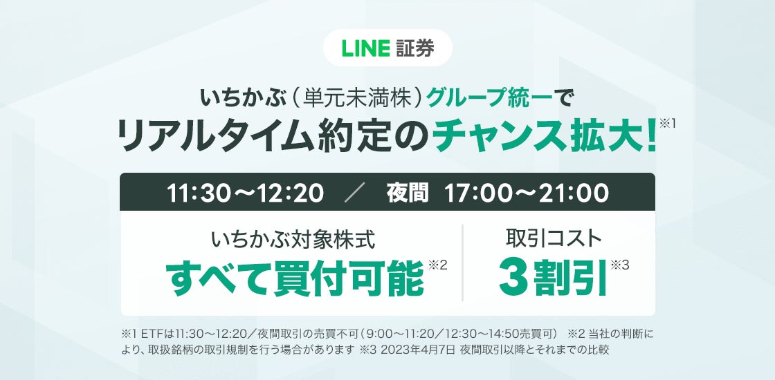 LINE証券株式会社(以下:LINE証券)は、スマホ投資サービス「LINE証券」において、2023年4月7日(金)の夜間取引(17:00~21:00)より、国内株式の単元未満株取引サービス「いちかぶ」に設けていた銘柄グループ(A・B)を統一いたしました。これにより、11:30~12:20および夜間取引においても「いちかぶ」対象株式がすべて買付可能※1,2となり、リアルタイム約定の機会が約3倍※3に拡大します。また、同時間帯の取引コストを1%から0.7%に引き下げました。