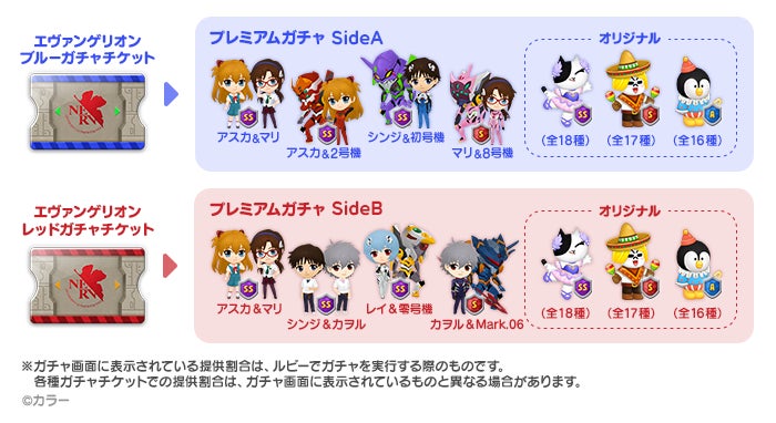 ほかにも、「シンジ&初号機(SS)」「レイ&零号機(SS)」「アスカ&マリ(SS)」などの限定なかまが獲得できる2種類のプレミアムガチャも登場します。