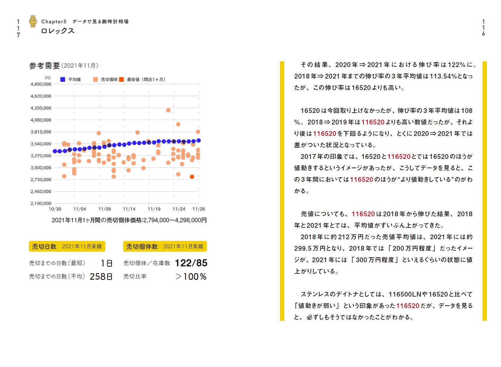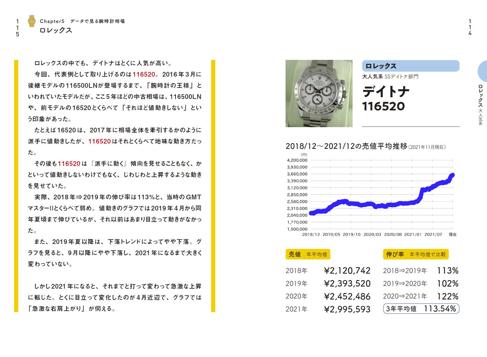 本書では、膨大な過去のデータをもとに、腕時計相場が成熟してきた変遷をたどりながら、各ブランドの相場の動きを具体的に解説。さらに約5000の型番から厳選した40型番について、それぞれカラー4ページを費やし、相場の変動を表すビジュアルなチャートとともに、その型番の特徴や市場における位置づけ、値動きの要因や売り時・買い時のタイミングを多角的に分析しています。もちろん、日本初公開の相場変遷データです。