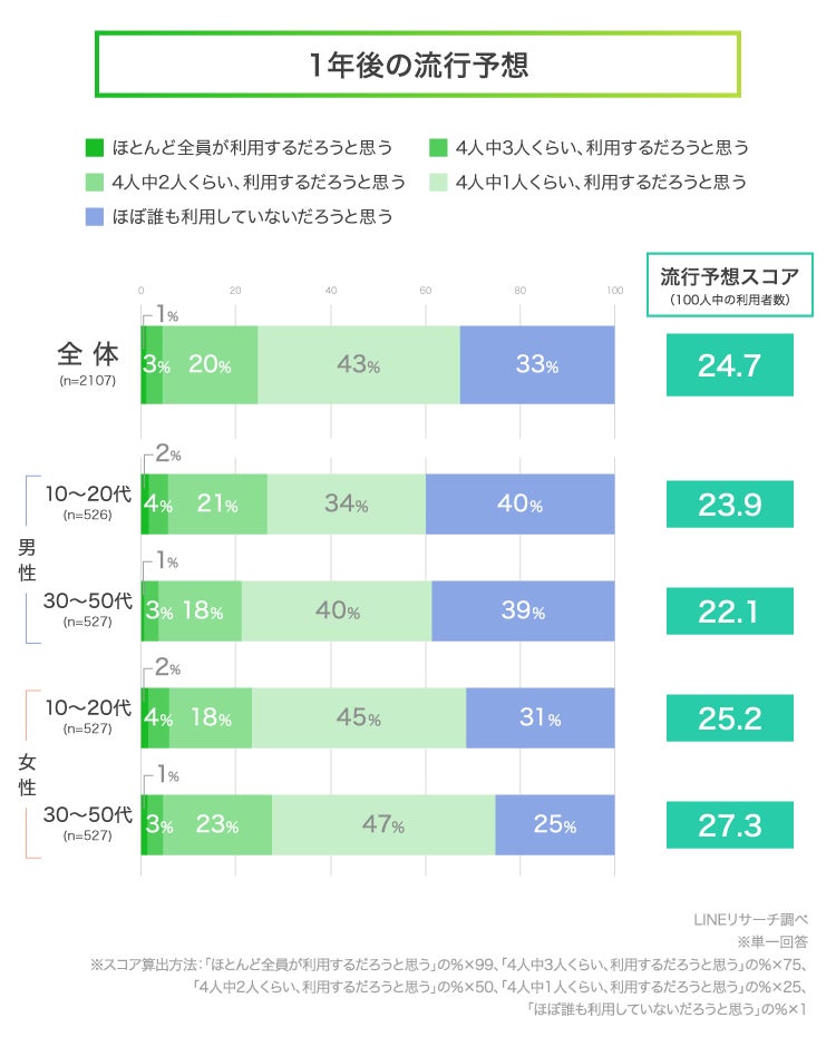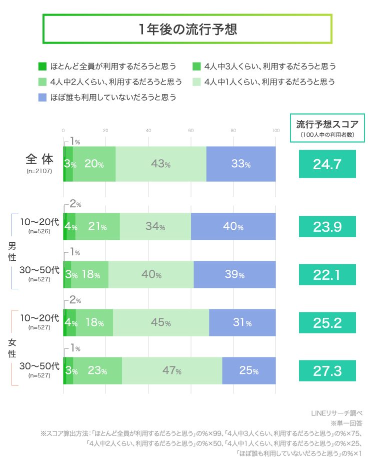 グラフにある流行予想スコアは、100人中どのくらいの人が1年後に利用していそうかを算出した数値です。