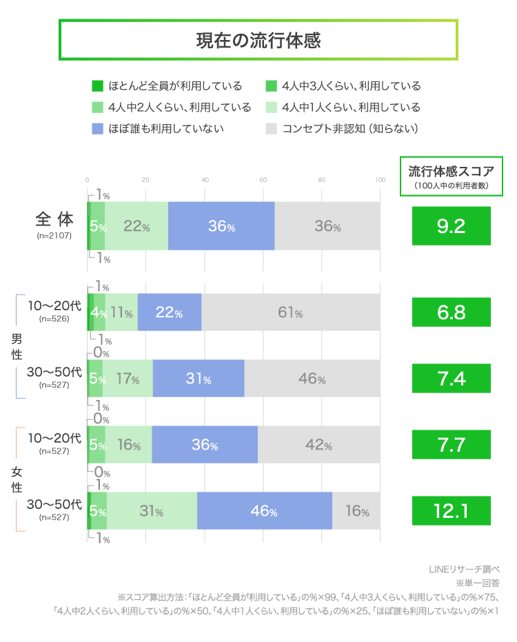 その結果「ミールキット」の流行体感スコアは全体で「9.2」で、およそ10人に1人が利用しているイメージを持たれていることがわかりました。