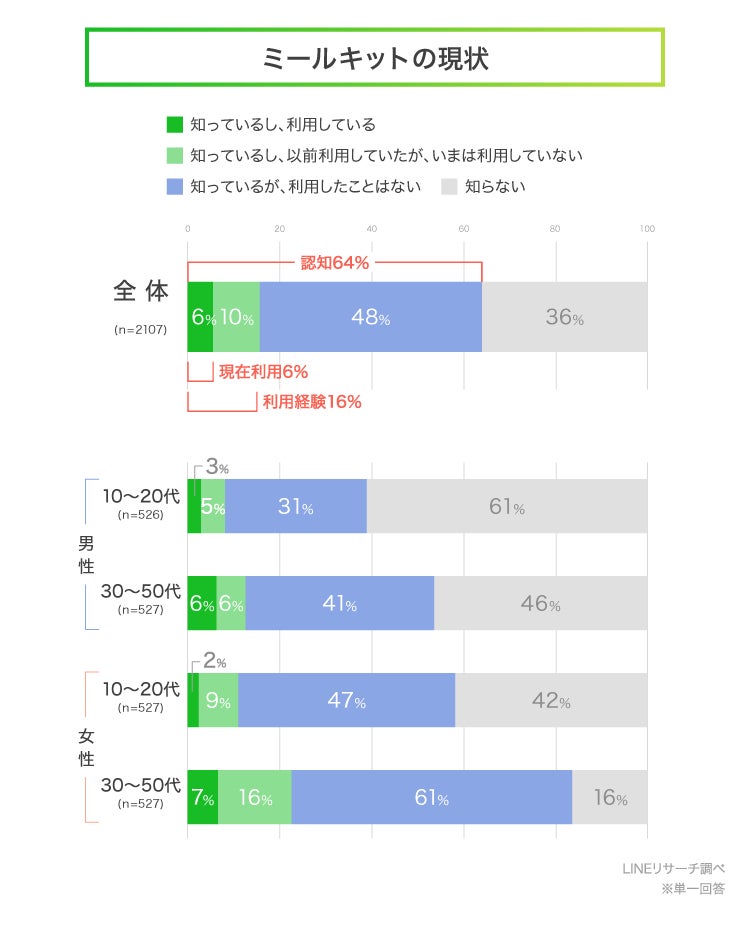 【LINEリサーチ】「ミールキット」の認知率は全体で6割超 今後の利用意向は10~20代女性でもっとも高く、半数以上という結果に
