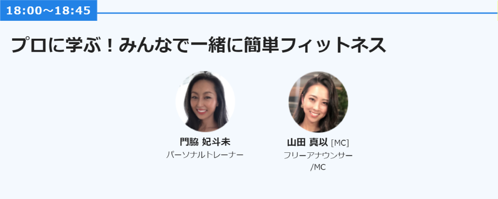 18:00〜18:45 ⑥プロに学ぶ!みんなで一緒に簡単フィットネス
